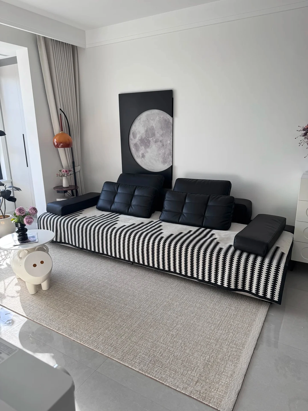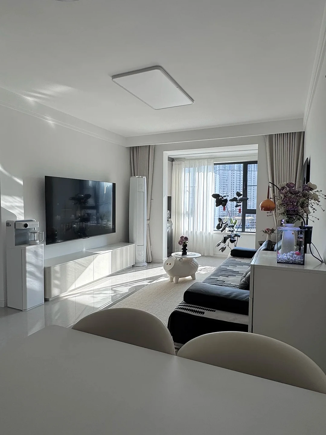 一进客厅,映入眼帘的是纯净的白色墙面,搭配浅灰色地砖,营造出简洁大气的氛围。无主灯设计搭配简约的吸顶灯,光线柔和,让整个空间温馨又明亮。黑色的皮质沙发,线条流畅,搭配黑白几何图案的抱枕,时尚感满满。可可爱爱的小猪造型茶几,增添了几分俏皮。